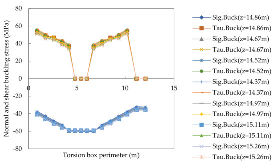 Evolution of elastic buckling stress, normal (Sig.Buck) and shear (Tau.Buck), along the perimeter of the torsion box for the different values of the width variable.