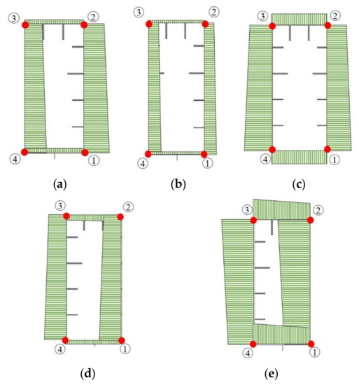 The dimensions defined in Table 3 and Table 4 refer to the baseline and centreline, respectively, according to Figure 2. The process of modifying the dimensions of the torsion box, particularized in the height variable, is established by altering nodes 1 and 4 at the same time, while the width variable is arranged by changing nodes 3 and 4, and those corresponding to the rest of the double hull side to be parallel to the side shell. The calculation procedure keeps the main particulars of the container ship constant in all combinations, and the results on the perimeter of the torsion box are obtained in a counter clockwise path following the numbering of nodes 1–4, along arbitrary control points between nodes.