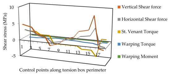 The modification of values, shear and warping stress distribution, at the torsion box perimeter is assessed for geometrical modifications that define the dimensions of it. Figure 14 shows the shear and warping stress distribution for the initial case of the torsion box width and height.