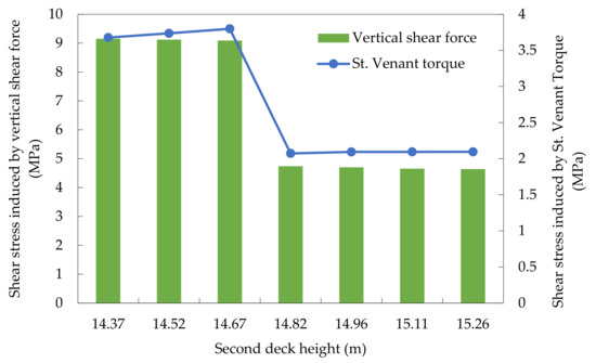 Figure 15 shows the variation in the value of the shear stresses induced by the vertical shear force and St. Venant torque, particularly at the lowest side shell location, in response to changes in the value of the torsion box height, in terms of the second deck height.