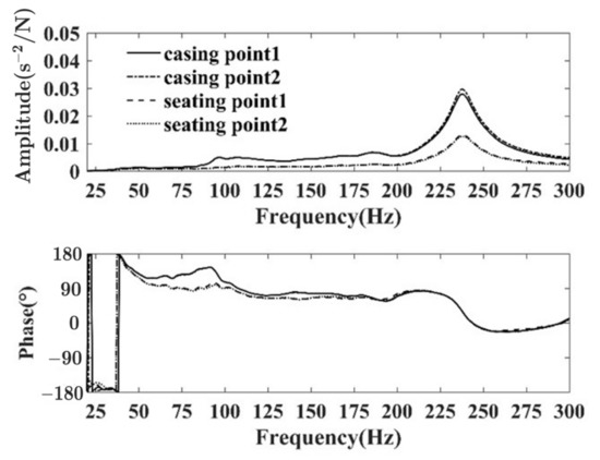 Figure 2 shows the acceleration frequency response curve of the thrust bearing tested at a static thrust of 30 kN and a shaft speed of 60 rpm. In Figure 2, the casting points denote the two sensors at the top, and the seating points denote the two sensors at the base. It can be seen that the acceleration frequency responses of the two measurement points of the thrust bearing housing are consistent, indicating that the housing is vibrating as a whole, and a similar situation occurs in the base. The acceleration frequency response curves of the housing and base are similar, with only the peaks differing, indicating that the longitudinal vibration attenuates in the transmission channel of the thrust bearing structure. Except for those of the low frequencies, all phase angles are between 0°∼180°, indicating that only the first-order longitudinal vibration exists in the 300 Hz frequency range. Its corresponding natural frequency value is 237.5 Hz. There are several resonance peaks of lower amplitude on the housing’s acceleration frequency response curve, related to local resonances in the thrust bearing, which are discussed in Section 5.