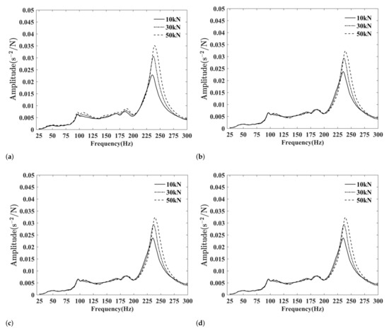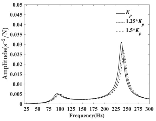 To verify the previous inference that the stiffness of the airbag affects the resonant frequency, we varied the stiffness and calculated the corresponding acceleration frequency response of the thrust bearing, based on the identified dynamic parameters. The results are shown in Figure 10. Unlike Figure 4, the resonance peak in Figure 10 decreases as the stiffness increases, because in the theoretical calculation only the stiffness changed, while the damping ratio of the shafting structure did not. In our vibration tests, they changed simultaneously when the static thrust was adjusted.