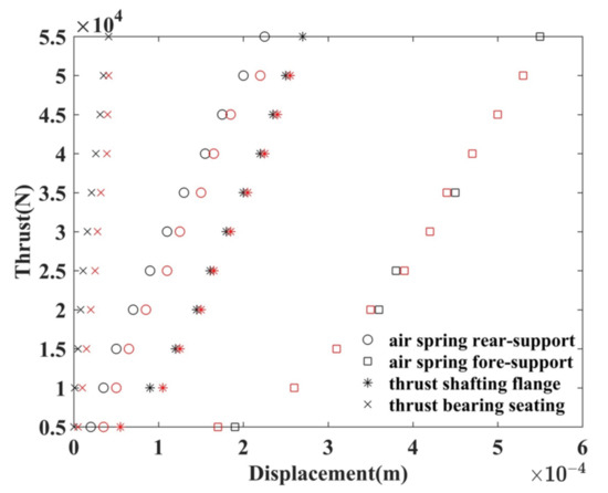 The static thrust force was applied to the stern end in certain load steps, and the displacement was measured at each step. We used 11 steps during the test. A percentage meter is located on the front and rear supports of the airbag, the thrust shaft flange, and the foot of the thrust bearing to measure the displacement values. The stiffness of the shafting system can be obtained at different speeds to analyze the variation of stiffness. To reduce random error interference, we repeated the process at the same speed to obtain an average value. We present the “static thrust-displacement” test data at 60 rpm in Figure 5, as the results at different rotational speeds are consistent. In Figure 5, the black points stand for loading and the red for unloading. It can be seen that the displacements during loading and unloading are not consistent, especially in the case of the airbag front bracket. The front bracket has a weaker stiffness than the rear and is the main direction of the airbag’s deformation.