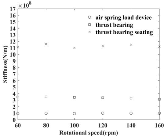We calculate the fluctuating values of different rotational speeds, comparing with the fitted stiffness of rotational speed 60 rpm. The results are present in Table 2 and confirm our point clearly and directly, i.e., the static thrust device, thrust bearing, and base stiffness are stable at different rotational speeds. It can be seen that no fluctuating value exceeds 10%.