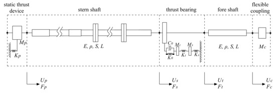 The shafting system is suitable for the analysis of its longitudinal vibration, using the transfer matrix method, because of its typical chain characteristic. The model of the test rig shafting system is shown in Figure 7, from the air spring static thrust device to the flexible coupling. In Figure 7, the shaft is simplified to a series of continuous uniform shafts, and the slave end of the flexible coupling is simplified to a concentrated mass. As the static thrust and the hammer excitation are applied in parallel at the stern end, the static thrust device also transmits the longitudinal vibrations and is equivalent to a shafting branch, which is simplified as a “spring-mass” system. The thrust bearing is also a branch of the shafting and has two longitudinal transmission channels: (1) the fore shaft, which transmits vibrations to the flexible coupling, and (2) the thrust ring, which transmits vibrations to the internal structures, such as the thrust block, and the base. Certainly, (2) is primary. Therefore, as shown in Figure 7, the model includes three types of dynamic components: concentrated mass, uniform shaft, and branch.