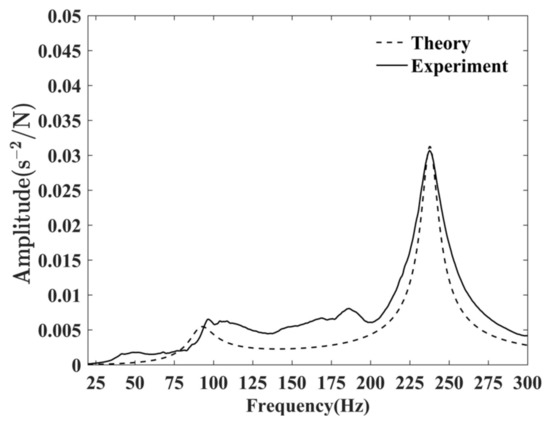 Substituting these parameters into the model of the shafting system, we calculated the theoretical results as shown in Figure 9. It can be found that the theoretical and experimental acceleration frequency responses are in good agreement, confirming that the transfer matrix model can simulate the actual longitudinal vibration characteristics.