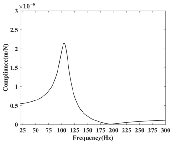 By substituting the identified parameters into Equation (5), we have the dynamic flexibility curve shown in Figure 11. The peak of the curve corresponds to the natural frequency of the thrust bearing, which is 103 Hz. According to the test results shown in Figure 2, the frequency of the first local resonance peak is 98 Hz, which is closer to the natural frequency of the thrust bearing, indicating that it is generated by the resonance of the thrust bearing. The coupling between the thrust bearing and the shafting is weak at this time.