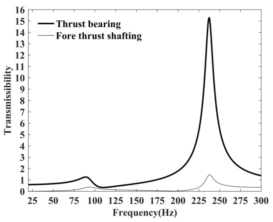 As mentioned previously, the thrust bearing and the fore shaft are two paths of longitudinal vibrations. The primary path can be identified by comparing the excitation forces transmitted. The hammer excitation data were collected for spectral analysis and, together with the identified parameters, substituted into the shafting model. We calculated the excitation forces transferred to the thrust bearing and front thrust shaft, respectively. The results of the transmissibility are shown in Figure 12. The comparison shows that the thrust bearing is the main transmission channel for longitudinal shafting vibration. In addition, the force transmission characteristics show that the hammer excitation force is significantly amplified in the resonant state of the shafting system.