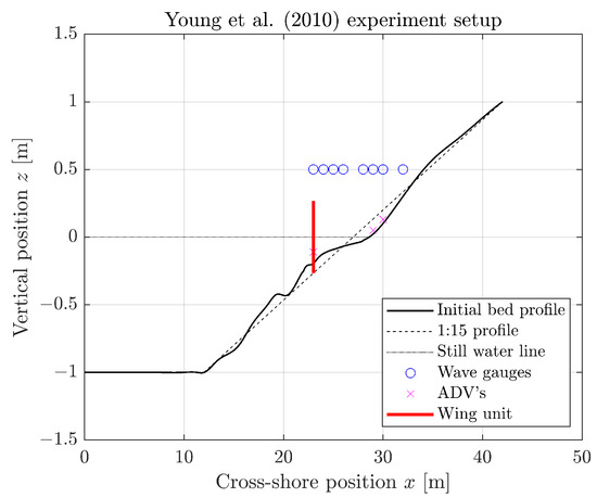 The analyses in this paper use the solitary wave experiments from Young et al. [33] as a basis. An overview of the experimental setup is shown in Figure 1. In the experiment, nine independent consecutive solitary waves with a wave height of were generated by a paddle and sent onto a beach consisting of fine sand (). After a 12-metre-long straight immobile section, there is a sandy bed with a slope of roughly 1:15. The initial beach profile is not straight, because the experiment setup was used for different waves prior to the ones published in the study of Young et al. [33]. The water depth is 1m which gives a initial shoreline position of roughly .