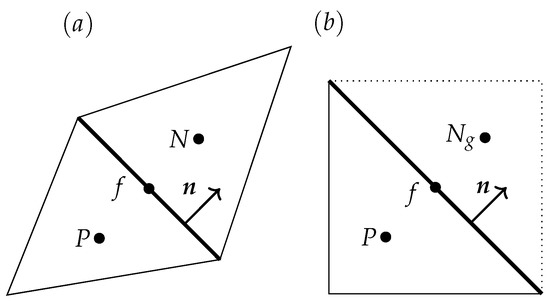 Schematic figure of (a) two cells P (parent) and N (neighbour) and (b) a boundary cell P with its ghost cell . f is the face between two cells and defines the normal vector.