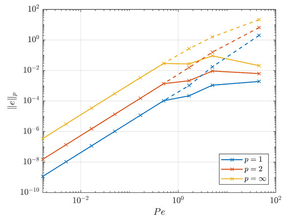 Figure showing the dependence error on the Peclet number, as measured in three different norms. The dashed lines show the performance of the old scheme and the full lines show the performance of the new scheme.