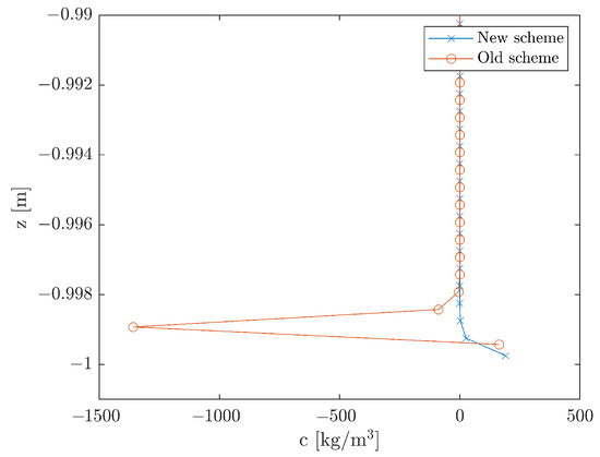 where , and are the local cell velocity normal to the boundary face, cell width normal to the boundary face and diffusion coefficient, respectively. When , the regular 2nd order central difference discretisation of the advection–diffusion equation results in wiggly solutions [48]. To mitigate this, a different discretisation of the advection operator needs to be employed. For such applications, TVD (Total Variation Diminishing) schemes provide a good solution as they can remove the wiggles without sacrificing numerical accuracy. In OpenFOAM this is implemented for internal faces; however, for boundary faces the issue persists. For suspended sediment applications, this can lead to regions of negative sediment concentration near the bed. In this section, we describe this problem and show a solution that effectively applies the method used for internal cells to boundary cells.