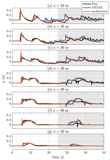 Figure 6 shows how the models compare to the measurements in terms of surface elevation. Here, two models using the different VoF methods, MULES and isoAdvector, are compared.