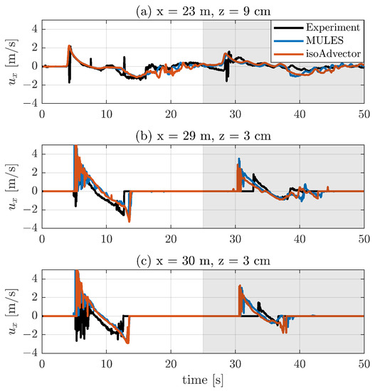 Comparison of cross-shore water velocity between the experiments and two models, using MULES and isoAdvector respectively, at three different cross-locations. Both models use the Engelund and Fredsoe [37] reference concentration model. The last 25 s are shown with a grey background.