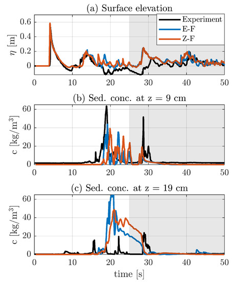Comparison between measurements and models at the wing unit location () showing surface elevation (a) and sediment concentrations at 9 cm (b) and 19 cm (c) above the initial bed respectively. The sediment concentrations are modelled using the Engelund and Fredsoe [37] and Zyserman and Fredsøe [39] models, respectively. Both models use the MULES VoF approach. The last 25 s are shown with a grey background.