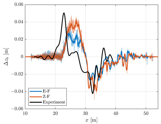 A comparison of measured and modelled bathymetric change produced by the Engelund and Fredsoe [37] (E-F) and Zyserman and Fredsøe [39] (Z-F) models, after three consecutive solitary wave events. The thin line shows the original data and the thick line shows the same data after a Gaussian smoothing operation.