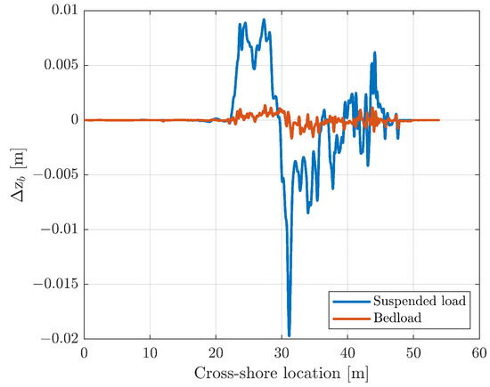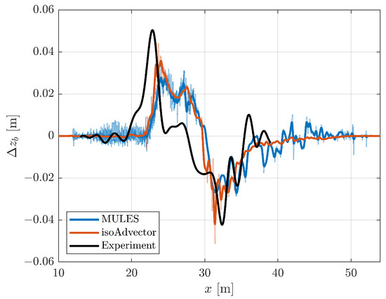 Figure 9 shows the morphodynamic change induced by the three consecutive solitary waves for the models using MULES and the two reference concentration models. Both models correctly predict that sediment has been picked up from the shore and deposited offshore. The models predict the correct location of maximum erosion; however, the location of maximum deposition is more shoreward compared with the experiments. Both models show a slight underprediction of the maximum erosion depth and the maximum deposition height. They further develop small-scale bedforms between and . These bedforms have a wavelength of and are roughly 1 cm high. The study by Young et al. [33], however, does not mention the presence of ripples.