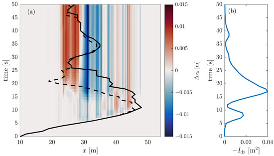 Figure showing the morphological change and runup (a) and integrated bed level change (b) over time, as predicted by the model. The black lines show the runup, defined as the maximum position where a certain increase in surface elevation compared with the initial condition is recorded (elevation of 1 cm for the straight line and 2 cm for the dashed line).