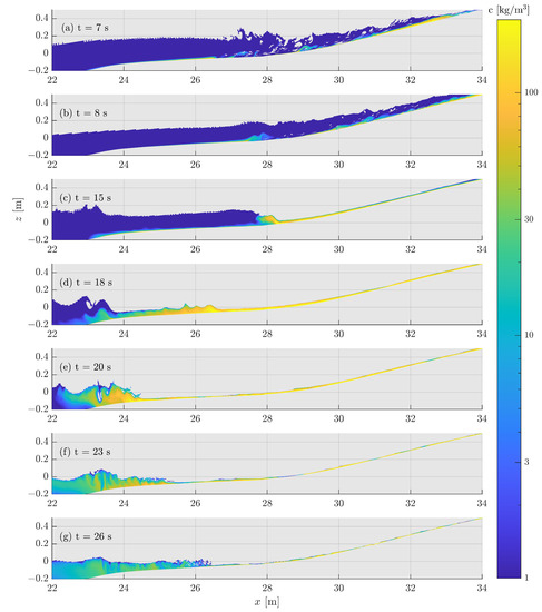 The suspended sediment concentration also varies strongly in time. As seen in Figure 11, during the latter stages of the uprush, the suspended sediment volume reaches a maximum and declines as the flow reverses. Later, at the end of the backwash, the suspended sediment volume reaches its global maximum. This metric does not give any information on the location of erosion and deposition. However, the fact that the suspended volume has a global maximum during the backwash is expected given the erosive bed response. It would be interesting to investigate how this metric behaves for different wave conditions, such as bichromatic or irregular waves. For instance, if the maximum of the suspension volume would occur during the uprush, this could be indicative of an accretive swash event. Particularly, given the difficulties of modelling accretive conditions e.g., discussed in [9], it would be interesting to analyse how the time series of sediment concentrations and swash velocities would differ between erosive and accretive wave conditions. The presented model is very suitable for such studies, since it can give both detailed temporal and spatial information on the suspended sediment load.