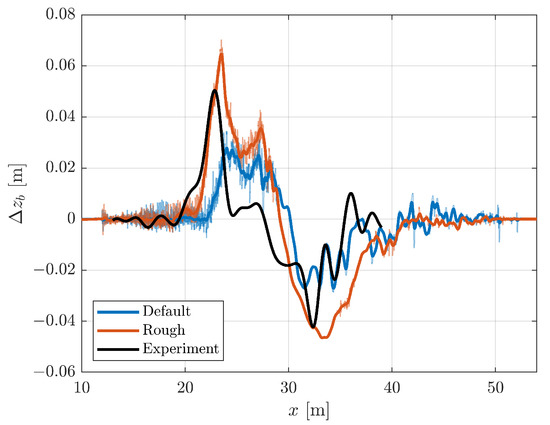 The model will presently be used to study morphodynamics of solitary waves. The solitary waves were generated using the waves2Foam module [36], by using the analytical formula by Chappelear [46] to determine the initial surface elevation, pressure and velocity fields corresponding to a solitary wave with its crest at . Because of this, the start time of the simulation does not correspond to the start time of the experiments. The time difference was determined to be 3.37 s by measuring the time when the wave crest passed the wave gauge at . The simulations were run for 50 s.