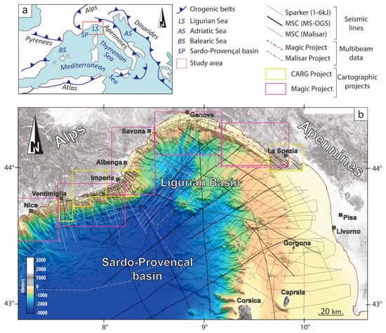 - Dessa, J.-X.; Beslier, M.-O.; Schenini, L.; Chamot-Rooke, N.; Corradi, N.; Delescluse, M.; Déverchère, J.; Larroque, C.; Sambolian, S.; Canva, A. Seismic exploration of the deep structure and seismogenic faults in the Ligurian Sea by joint multi channel and ocean bottom seismic acquisitions: Preliminary results of the SEFASILS Cruise. Geosciences 2020, 10, 108. [Google Scholar] [CrossRef]