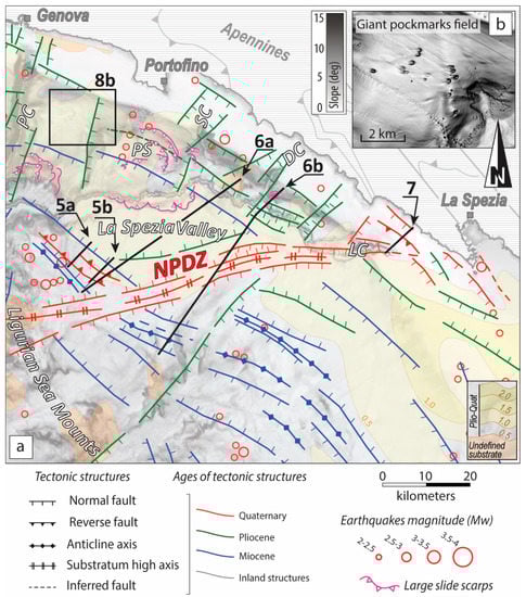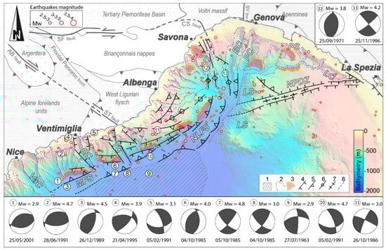 - Larroque, C.; de Lépinay, B.M.; Migeon, S. Morphotectonic and fault–earthquake relationships along the northern Ligurian margin (western Mediterranean) based on high resolution, multibeam bathymetry and multichannel seismic-reflection profiles. Mar. Geophys. Res. 2011, 32, 163–179. [Google Scholar] [CrossRef]