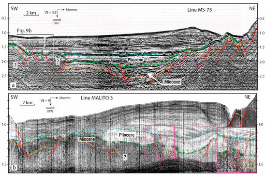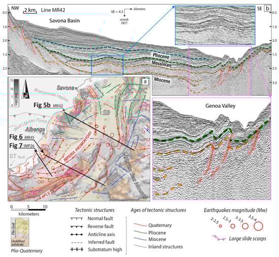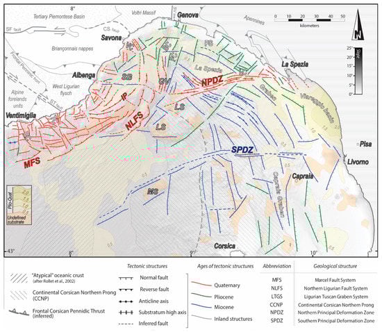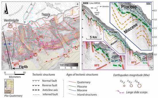 - Bigot-Cormier, F.; Sage, F.; Marc, S.; Déverchère, J.; Ferrandini, M.; Guennoc, P.; Popoff, M.; Stéphan, J.-F. Déformations pliocènes de la marge nord-Ligure (France): Les conséquences d’un chevauchement crustal sud-alpin—Pliocene deformation of the north-Ligurian margin (France): Consequences of a south-Alpine crustal thrust. Bull. Soc. Geol. Fr. 2004, 175, 197–211. [Google Scholar] [CrossRef]