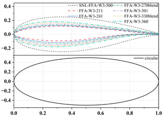 The 15 MW reference wind turbine model [] provided by the NREL is referred to in this paper. The rotor diameter of the wind turbine is 240 m, and the hub height is 150 m. The blades of the wind turbine consist of eight types of airfoils, as shown in Figure 1. The wind turbine adopts the direct-drive layout for its nacelle. The maximal rotor speed can reach 7.56 rpm. The controllers of the generator torque and blade pitch are designed to maintain stable output power. The detailed properties of the wind turbine are shown in Table 1.