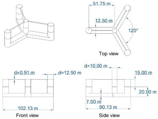 In deep water, a floating foundation is generally used to support the superstructure (including the rotor and tower). The University of Maine (UMaine) VolturnUS-S reference foundation was considered in this study []. It is composed of three outer columns, a central column, and three rectangular pontoons at the bottom, as shown in Figure 2. The outer columns are connected to the central column via three cross braces at the top of the columns, making the overall structure relatively stable. The three bottom pontoons are attached to the bottom of the columns, respectively. The overall height of the foundation is 35 m, with a draft of 20 m and a freeboard of 15 m, and the maximum width is 102.13 m. The detailed parameters of the floating foundation are shown in Table 2.