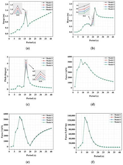 The comparison of the RAOs of the different mesh models in the 0-degree wave direction: (a) RAOs of surge motion; (b) RAOs of heave motion; (c) RAOs of pitch motion; (d) RAOs of Force 1; (e) RAOs of Force 3; (f) RAOs of Force 5.