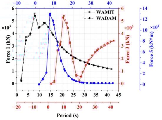 For the accuracy of the subsequent numerical simulation, it was necessary to conduct verification of the hydrodynamic data. This study calculated the hydrodynamic coefficients of the floating foundation, using WADAM []. First-order wave excitation loads from WADAM were compared in the same wave direction with the reference data from WAMIT [] provided by the NREL [], and the results are illustrated in Figure 6. For brevity, the comparisons of the wave excitation forces in three different degree-of-freedom directions are all shown in the same graph. There are three colors in Figure 6; the axes, titles, and curves of the same color represent information on the wave excitation forces in each of the three directions. The horizontal axes show different wave periods and the vertical axes show the magnitude of the excitation force. The different colored curves indicate wave excitation loads for different degrees of freedom, corresponding to the same colored horizontal and vertical axes. The red curves represent the wave excitation loads in the vertical direction, and the blue curves represent the wave excitation moments about the y axis. The legend of Figure 6 shows the results from WAMIT and WADAM. The terms “Force 1”, “Force 3”, and “Force 5” have the same meaning as above. It can be seen that the first-order wave excitation loads calculated in WADAM well matched the reference data in the three-degrees-of-freedom direction, proving that the assessment of the hydrodynamic performance of the floating foundation in this paper is reliable.