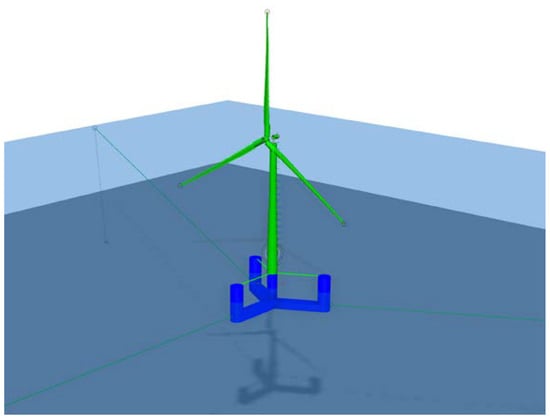 Subsequently, the floating foundation model was combined with the numerical models of the rotor, tower, and mooring system in SIMA to construct an integrated 15 MW FOWT, as shown in Figure 7.