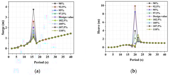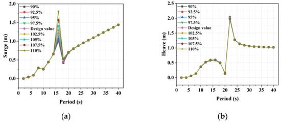 In addition, within the variation range of the column diameter studied in this paper, the effect of the diameter change on the peak value of the surge transfer function was also limited. However, with the continuous increase of the column diameter, the peak value showed an apparent upward trend. Specifically, for the variation range of the column diameter smaller than the original design value, the change had little effect on the peak value of the surge transfer function. However, within the range of column diameter larger than the original design value, the increase made the peak value of the surge transfer function more significant. The influence of column diameter variation on the peak value of the sway transfer function was similar to that for the surge transfer function.