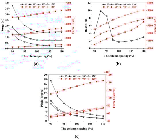 The peak values of those transfer functions were analyzed, and the results are shown in Figure 9. The horizontal axis of Figure 9 indicates the different column spacing, and the vertical axis represents the magnitude of the peak values for the transfer functions. The black solid lines in Figure 9 give the variation curves of the peak motion transfer function values with the change of column spacing, and the magnitude of the peak value is indicated by the black vertical axis on the left side of the plot. The red dotted lines represent the variation curves of the peak values for the wave excitation load transfer functions, and the magnitude of the peak values is shown by the red vertical axis on the right side of the diagram. The curves with different symbols represent the variation curves of the peak values for transfer functions in different wave directions. For example, the black solid line with the square symbol in Figure 9c represents the variation curve of the peak value for surge transfer function with the change of column spacing in the 0-degree wave direction. The red dotted line with the circular symbol represents the variation curve of the peak value of the longitudinal wave excitation moment transfer function with the change of column spacing in a 60-degree wave direction.
