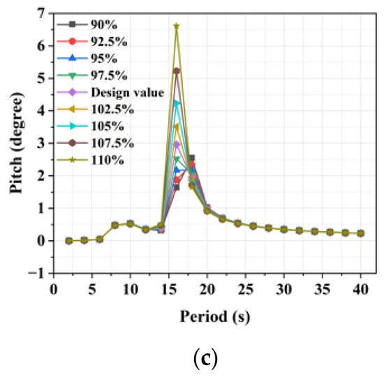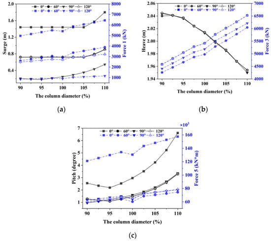 According to the above results, the effect of the column diameter on the hydrodynamic performance was studied, based on the above optimized floating foundation, to facilitate the further performance optimization of the foundation. The investigation into the influence of the column diameter on the hydrodynamic performance adopted the same method as above. Other structural parameters of the foundation were kept unchanged, and the column diameter was changed with a step size of 2.5% within the range of 90% to 110% of the design value of the outer column diameter. The hydrodynamic data were calculated for the floating foundation with different outer column diameters. The transfer functions of the motion and wave excitation forces were analyzed, as shown in Figure 10. Curves with different colors and symbols are used in Figure 10 to represent the motion transfer functions for the floating foundations with different outer column diameters.
