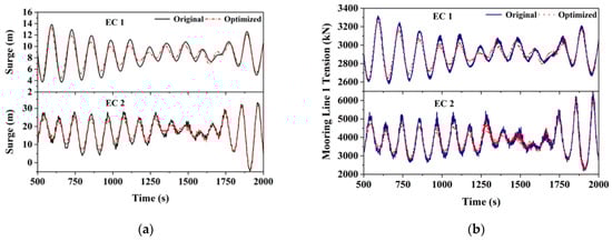 Figure 12 presents the surge response of the wind turbine in the time domain for the two sea states before and after optimization of the floating foundation. Under EC1 conditions, when the wind turbine was operating normally, the extreme values of the surge response of the wind turbine were significantly reduced after the floating foundation was optimized. In the time-domain simulation for the wind turbine with the optimized foundation, the maximum surge motion was 3.80% lower than that of the wind turbine with the original foundation, and the standard deviation of the surge response was reduced by 19.78%. This demonstrates that the surge motion of the optimized wind turbine was more moderate.