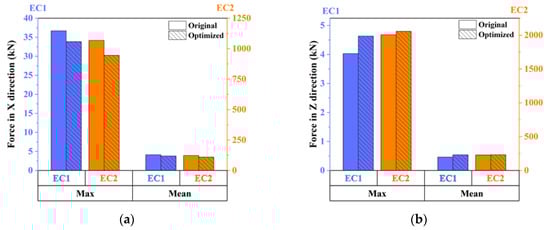 The mean-drift force of the optimized floating wind turbine was also studied. Figure 13 shows the mean value and maximum value of the mean-drift force experienced by the wind turbines with the original and optimized floating foundations in different sea conditions. In Figure 13, the horizontal axis represents the maximum and mean values of the mean-drift forces on the FOWT under the two environmental conditions in the time domain simulation. The bar with diagonal lines in the legend indicates the statistical values of the mean-drift forces generated by the optimized FOWT, and the bar without patterns inside indicates the statistical value of the mean-drift forces on the original FOWT before optimization. The orange bars represent the statistical values of the mean-drift forces to which the two FOWTs were subjected under EC2 conditions, the magnitude of which is indicated by the orange vertical axis on the right side of the figure. The blue bars represent the statistical values of the mean-drift forces on the two FOWTs under EC1 conditions, the magnitude of which shown in the blue vertical axis on the left side of the figure. For example, in Figure 13a, the leftmost blue bar without patterns inside shows the maximum value of the mean-drift forces on the original FOWT under EC1 conditions in the time domain simulation; the rightmost orange bar with diagonal lines represents the mean value of the mean-drift forces on the optimized FOWT under EC2 conditions.