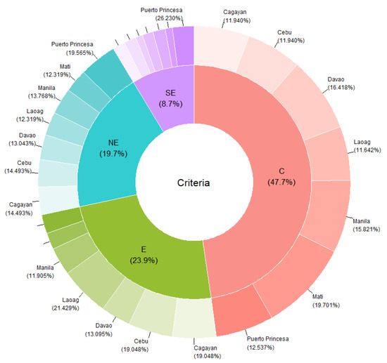Figure 3 demonstrates the percentage of each criterion according to the city. The overall result shows that the Philippines is a conservationist with a 47.7% overall rating, followed by extractive, non-extractive, and strongly extractive with 23.9%, 19.7%, and 8.7%, respectively. However, of all cities, Mati City has a higher value for the conservationist criterion, showing that the environment is essential in the city. Addtionally, Mati City and Puerto Princesa are the only cities that give high importance to non-extractive criteria. This means that even though the city is going for development, they are more concerned about the environment as part of their success in the development. These two cities are listed as naturally beautiful cities. Mati City is the location of the UNESCO Natural Heritage site and has three of the most beautiful top bays in the world. Additionally, Puerto Princesa is home of the most picturesque islands and underground rivers. On the contrary, other cities are urbanized cities.