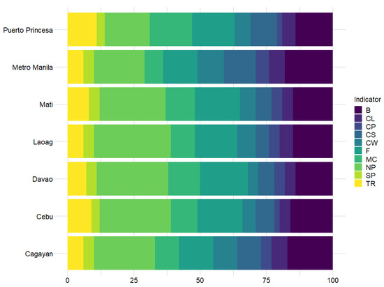 The Philippine government has mandated the protection, conservation, and sustainable development of the natural resources of the Province of Palawan through the Strategic Environmental Plan (SEP), Republic Act 7611. Puerto Princesa City is under the province of Palawan. The SEP is a comprehensive framework that serves the LGUs as a guide in formulating and implementing plans, programs, and projects affecting the province’s environment. The SEP is uniquely designed for Palawan due to its natural archipelagic beautiful landscape and abundance of biodiversity with many endemic animals in the land and sea. Thus, the result of the index framework emphasizes the first essential indicators, the natural products and fisheries, followed by marine culture and biodiversity (see Equation (9)).