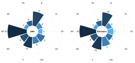 Table 23 shows the pairwise comparison matrix with the weights of the indicators. The researchers and educators give emphasis to NP (23%), B (17%), F (13%), MC (9%), and CS (9%). The CoZHI framework in these respondents is shown in Equation (13), with an acceptable consistency rating of 9.8%. The blue color bar in