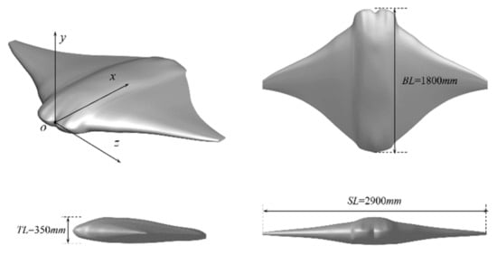 Through the real observation of the biological shape of the cow-nosed ray and three-dimensional software modeling, the final numerical simulation target model was obtained as shown in Figure 1. The dimensions of each model were defined as follows: body length (BL) = 1800 mm, spanwise length (SL) = 2900 mm, and maximum thickness length (TL) = 350 mm. This paper takes BL as the reference length and BL2 as the reference area.