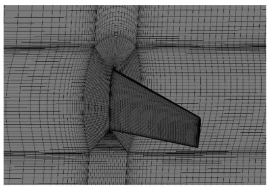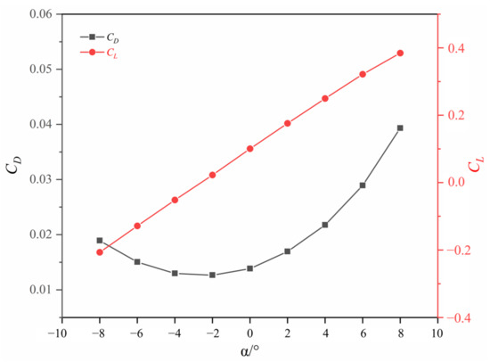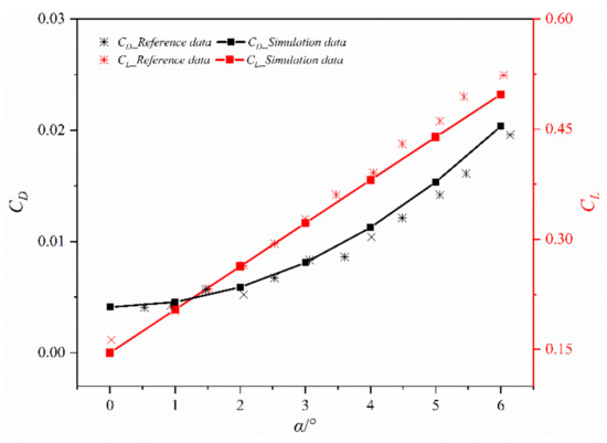 In order to ensure the correctness of the numerical simulation results, the calculation method was first verified. At present, domestic and foreign scholars have not carried out numerical simulation work on manta ray gliding. In addition, the model has an irregular shape, a high proportion of curved surfaces, and is difficult to process, which can only be obtained by additive manufacturing. Machining the model and performing wind-tunnel or water-tunnel experiments on it would have disadvantages, such as a high cost and long time, which do not meet the requirements of previous mechanistic research. Therefore, the method of CFD simulation was used to study this problem. Observing the shape characteristics of the manta ray, it can be seen that its topology is similar to the three-dimensional hydrofoil. The scholar Zarruk [35] experimentally measured the hydrodynamic parameters of a graphical model 3D hydrofoil with different materials, Reynolds number (Re), and angle of attack (α). The root chord length of the model was 0.12 m, the wing chord length was 0.06 m, and the spread length was 0.3 m. The average chord length of 0.09 m was taken as the reference length. For this model, the grid was drawn as shown in Figure 2. The numerical simulation method and turbulence model of SST k-ω in this paper was used to calculate the variation, with the angle of attack law for the three-dimensional hydrofoil lift coefficient and resistance coefficient when the Reynolds number is 1 × 106. ν is the kinematic viscosity coefficient of water, which is 1.003 × 10−6. The simulation results were compared with the experimental values, and the results are shown in Figure 3. It can be seen that the simulation results were in good agreement with the experimental data, indicating that the calculation method used in this paper has great reliability.