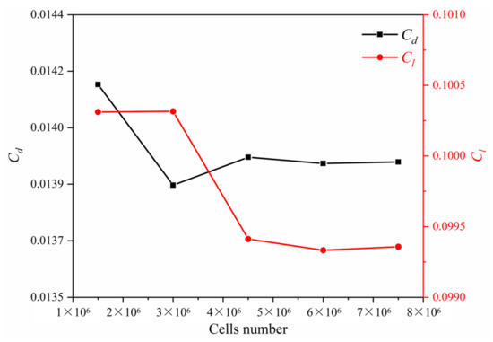 The numerical simulation results are closely related to the number of cells. In order to ensure the correctness of the manta ray gliding simulation, it was necessary to carry out grid-independent verification. Draw the manta ray structure grid as shown in Figure 4. The typical y+ value of the first grid point near the manta ray surface was set as 1, and the Re was 9 × 105. The overall grid distribution density was changed and the lift and resistance values of the manta ray model was recorded for different numbers of cells, as shown in Figure 5. It can be concluded from Figure 5 that, when the number of cells is small, the lift and resistance values under the same working conditions change drastically with the increase in the number of cells. When the number of cells reaches 4.5 × 106, the lift and resistance values no longer change with the grid number. On the premise of ensuring the reliability of the simulation results, in order to improve the calculation efficiency and save simulation time, the grids of all subsequent working conditions were drawn using the node distribution law with the number of cells being 4.5 × 106. The number of cells of the manta ray pair system increases to 6.1 × 106 due to the addition of one individual and will further grow as the distance between the two manta rays increases.