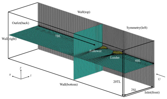 In order to explore the hydrodynamic characteristics of the manta ray pair’s tandem gliding system, the structure grid was drawn as shown in Figure 6. The two manta rays were distributed forward and backward along the x-axis, and the distance between the tail of the leader and the head of the follower was defined as Δs, which is measured as a multiple of the BL. Since the structure of the manta ray model was symmetrical, in order to reduce the number of cells and improve the calculation efficiency, half of the grid domain was drawn. The boundary condition on the left side was set as the symmetry plane, so the numerical simulation of the whole can be completed. In addition, the front side was set as the velocity inlet, the rear side was set as the pressure outlet, the surface of the manta ray model was set as a non-slip wall, and the other surfaces were set as free-slip walls. The overall computational domain was a cuboid. The height was set as 20 TL; the width was set as 2 SL; the leader’s head was 4 BL from the velocity inlet; the follower’s tail was 7 BL from the pressure outlet. The computational domain size and boundary condition settings are shown in Figure 6.