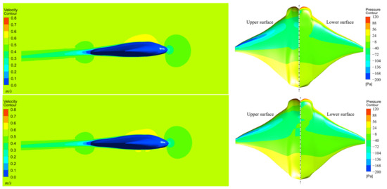 Longitudinal symmetry plane velocity distribution and manta ray surface pressure distribution during single gliding at α = 0° (up) and α = −2° (down).