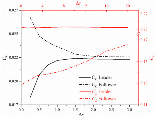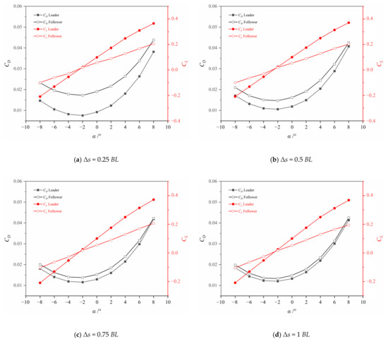 This part studies the differences in the hydrodynamic performance of two manta rays gliding. As shown in Figure 6, the leader manta ray and the follower manta ray are arranged horizontally along the x-axis, and the angle of attack changes synchronously from −8 to 8°. The hydrodynamic performance at the distances Δs = 0.25 BL, 0.5 BL, 0.75 BL, 1 BL were simulated, respectively, and the results are shown in Figure 9.