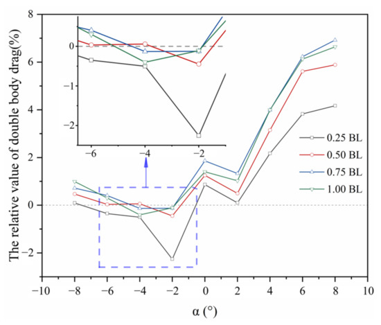 This part explores the hydrodynamic performance of the tandem gliding system under the influence of the two manta rays. Figure 11 shows the average resistance of the system relative to the resistance of a single manta ray when gliding under different distances and angles of attack. It can be seen from Figure 11 that, for most working conditions, the average resistance of the system is higher than that of the single case. After 2° angle of attack, the relative value of average system resistance gradually increases with the increase in attack angle. For example, when the angle of attack is 8° and Δs is 1 BL, the average resistance of the system is about 6.6% higher than that of the single case. It shows that, in most cases, the average resistance of the pair of manta rays’ tandem system is higher than the single manta ray’s resistance, and the energy consumption of the system increases. Interestingly, however, we found that when the angle of attack is −6° to −2°, the average resistance of the system is lower than the single resistance at some certain distance cases, which can play a role in reducing resistance and saving energy. For example, when the angle of attack is −2° and Δs is 0.25 BL, the average resistance of the system is about 2.3% lower than that of the single manta case.