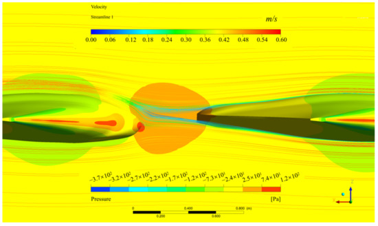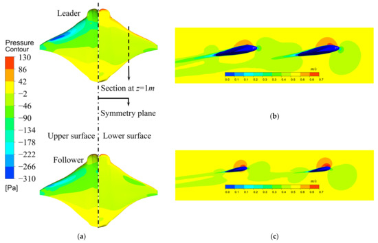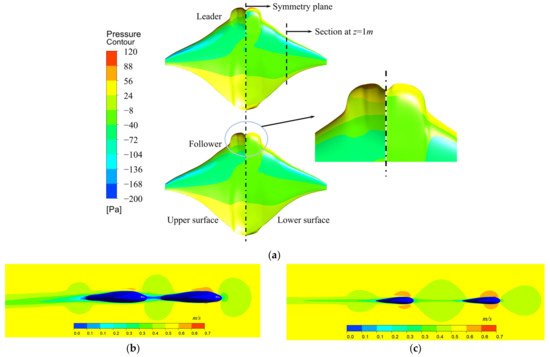 In order to explore the fluid mechanism of the average resistance of the system, we give the pressure and velocity distribution of α = −2°, Δs = 0.25 BL and α = 8°, Δs = 1 BL, respectively, as shown in Figure 12 and Figure 13. Figure 12 shows the surface pressure distribution of the tandem manta rays at α = −2°, Δs = 0.25 BL, and the velocity distribution of some section planes are also given in the figure. Comparing Figure 8 and Figure 12a, it can be seen that a continuous low-speed zone is formed between the tail of the leader and the head of the follower. Due to the presence of this area, the pressure on the leader’s tail and the follower’s head increases. Under the premise of little change in the rest, the front-to-back pressure difference of the leader decreases, resulting in decreased resistance. The front-to-back pressure difference of the follower increases, resulting in increased resistance. As for the overall system, the low-speed area at the tail of the leader has not closed and disappeared, and it is affected by the follower and continues to develop backward. Therefore, a coherent high-pressure area is formed between the leader and the follower, as shown in Figure 12 and Figure 13, which makes the average resistance of the system decrease slightly.