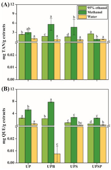Total polyphenol (A) and flavonoid (B) content of different parts of Undaria pinnatifida. UP: whole U. pinnatifida, UPB: U. pinnatifida blade, UPS: U. pinnatifida stipe, UPSP: U. pinnatifida sporophylls. TAN: tannic acid, QUE: quercetin. The different letters (a–d) indicate a significant difference (p < 0.05).