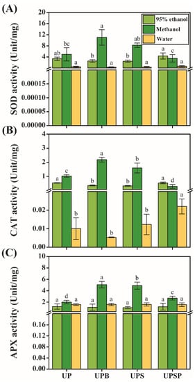 Plants have antioxidant enzymes, such as SOD, CAT, and APX, which can eliminate free radicals [40]. SOD converts reactive oxygen species, such as superoxide (O2.-), into H2O2, and CAT and APX convert H2O2 into water and oxygen. The SOD, CAT, and APX activities of different solvent extracts of the different parts of Asian kelp were measured. The results showed that the methanolic extracts of all parts of the Asian kelp showed higher antioxidant enzymatic activities than the ethanolic and hot water extracts. Among the methanolic extracts, the UPB, UPS, and UP extracts showed significantly higher SOD activity (Unit/mg) than the UPSP extract (Figure 2A); the UPB extract exhibited the highest SOD activity, which was 1.34, 2.24, and 3.15 times higher than that of the UPS, UP, and UPSP extracts, respectively. Among the ethanolic extracts, the UPSP extract (4.34 ± 1.10 Unit/mg) had the highest SOD activity, followed by the UP (3.33 ± 0.64 Unit/mg), UPB (2.51 ± 0.50 Unit/mg), and UPS (2.44 ± 0.45 Unit/mg) extracts. Among the hot water extracts, the UPSP extract showed the highest SOD activity (0.62 ± 0.27), but there was no significant difference in SOD activity between the extracts of the different parts.